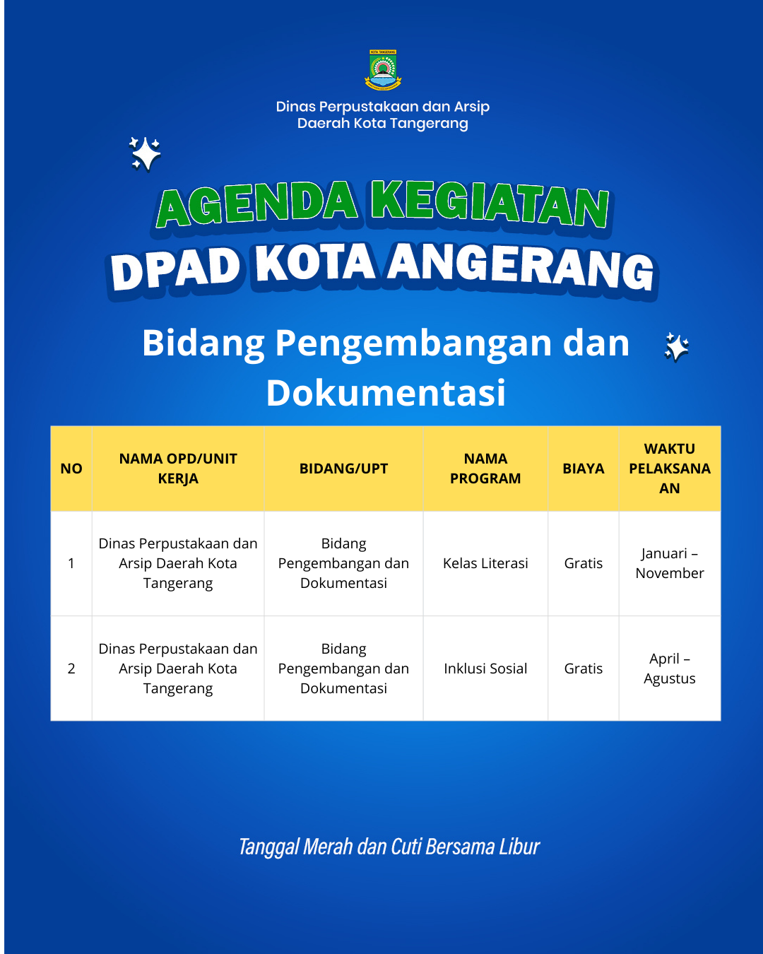 | Description Agenda | DESKRIPSI (PENJELASAN SINGKAT, SYARAT KETENTUAN DSB) CARA MENDAPATKAN/MENGIKUTI PROGRAM “Memantau Instagram @dpadkotatangerang untuk melihat flyer pengumuman pembukaan Kelas Literasi serta mendaftarkan diri melalui tautan Google Form yang disediakan oleh admin guna mengikuti Kelas Literasi yang diselenggarakan oleh DPAD Kota Tangerang.” DESKRIPSI (PENJELASAN SINGKAT, SYARAT KETENTUAN DSB) PELATIHAN INKLUSI SOSIAL adalah upaya pemberdayaan masyarakat melalui kegiatan pelatihan yang bersifat terbuka, setara, dan ramah bagi seluruh lapisan masyarakat. CARA MENDAPATKAN/MENGIKUTI PROGRAM |