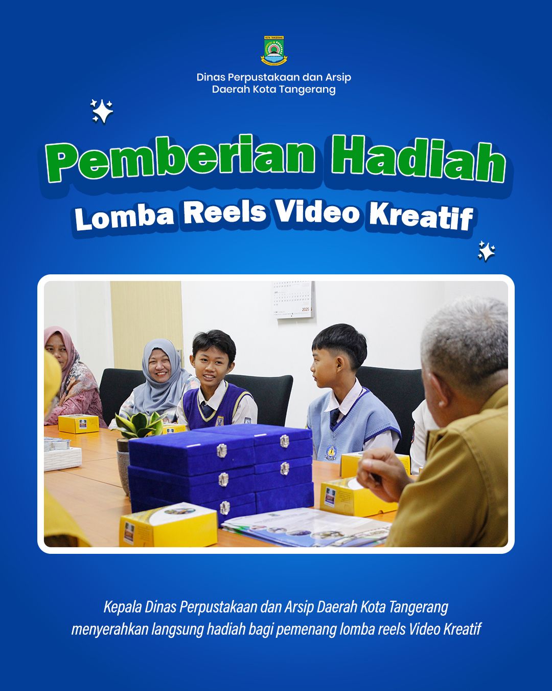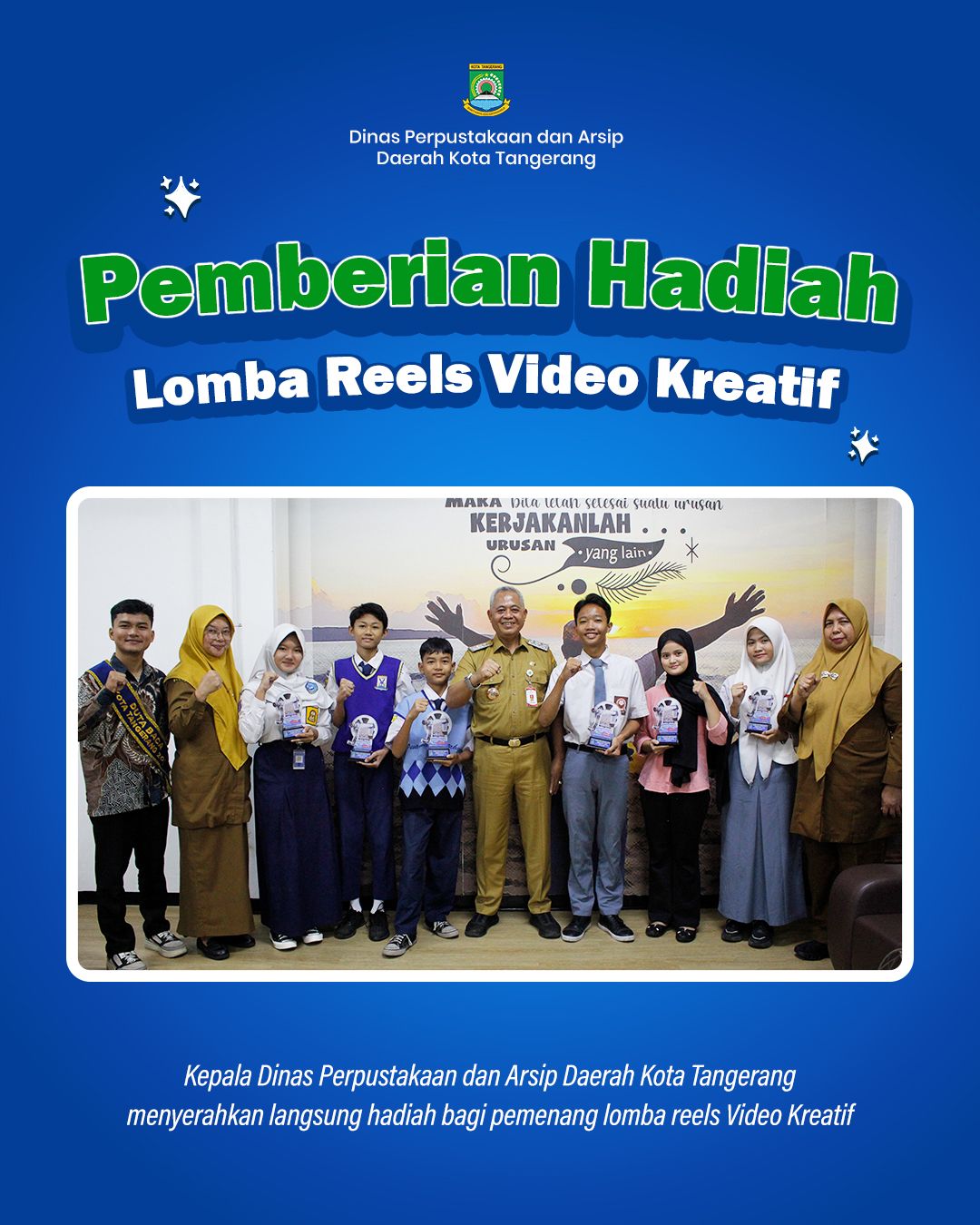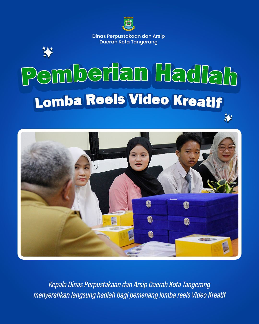 Kepala Dinas Perpustakaan dan Arsip Daerah (DPAD) Kota Tangerang menyerahkan secara langsung hadiah kepada para pemenang Lomba Reels Video Kreatif yang diselenggarakan sebagai upaya mendorong kreativitas generasi muda dalam mempromosikan literasi dan budaya baca.